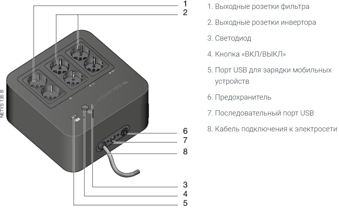 - 2 розетки с защитой только от повышения напряжения, предназначенные для питания менее важных потребителей и потребителей с высоким потреблением электроэнергии (например, лазерные принтеры).